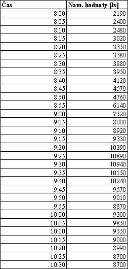 Intenzitu difúzneho žiarenia som merala v troch dňoch 19, 21.01.2001 a 07.03.2001. Merania boli vykonané digitálnym luxmetrom 0500, hodnoty boli namerané a zaznamenané v päťminutových intervaloch.